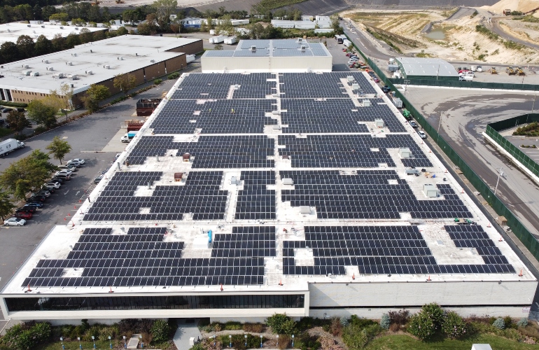 The Karp Associates building has two roof sections. The first, and original rooftop, is conventional TPO roofing material. SUNation installed most of the array on that section, totaling 3,456 ballasted panels. The second section is an addition that stands 40 ft tall with a metal standing seam roof. The remaining 972 panels are attached to that section.