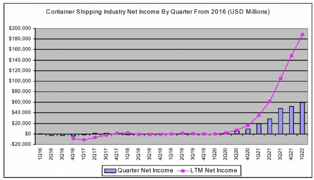 The container shipping industry profits in the first quarter of 2022 beat out those of FANG—an acronym for Facebook, Amazon, Netflix and Google—by 103%, expanding the gap from last year’s fourth quarter when liner industry profits beat FANGs by 14%, according to analysis by Blue Alpha Capital.