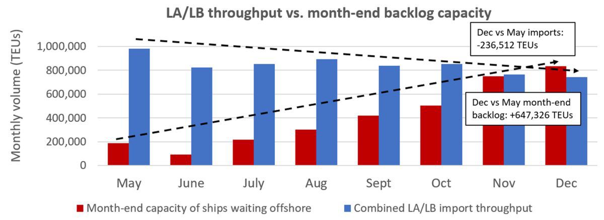As a result of the massive offshore backlog, changes in LA/LB container imports are not reflecting month-to-month changes in import demand, they’re reflecting changes in the ability of the LA/LB gateway system to handle inbound volumes from the queue.