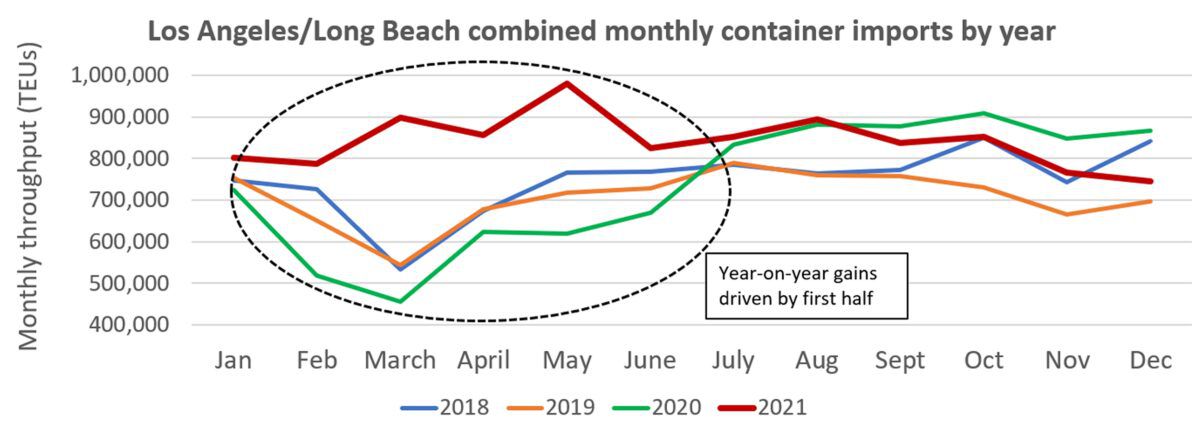 Combined import data from LA/LB confirm that last year’s record results were entirely driven by outperformance in the first half.