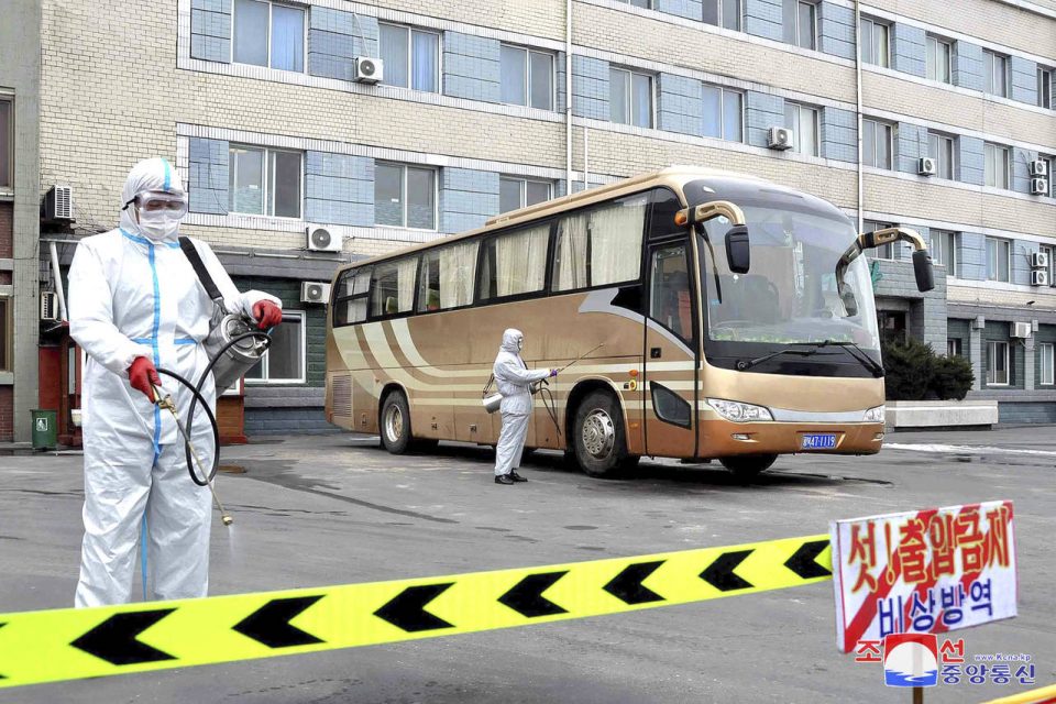 In this undated photo provided released on Wednesday, March 4, 2020, by the North Korean government, workers wearing protective suits spray disinfectant on a bus as a precaution against the new coronavirus at a parking lot in Sinuiju, North Korea. Independent journalists were not given access to cover the event depicted in this image distributed by the North Korean government. The content of this image is as provided and cannot be independently verified. Korean language watermark on image as provided by source reads: “KCNA” which is the abbreviation for Korean Central News Agency. (Korean Central News Agency/Korea News Service via AP)