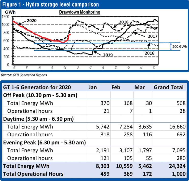 Ample hydro reserves were available for a larger hydro dispatch for both weeks to reduce expensive oil plants. As pointed out earlier, CEB actually underutilised hydro in April compared with CEB’s own projections shared and published by Water Management Secretariat, and this underutilisation was in Laxapana complex (100 GWh) which has no irrigation constraints.