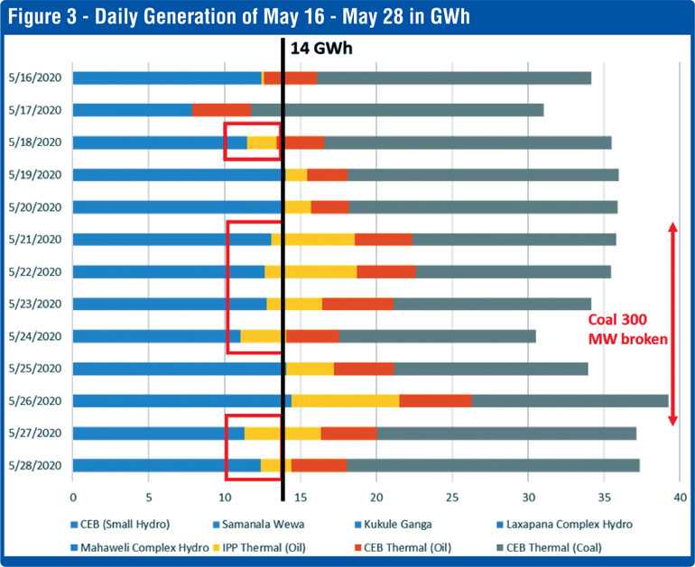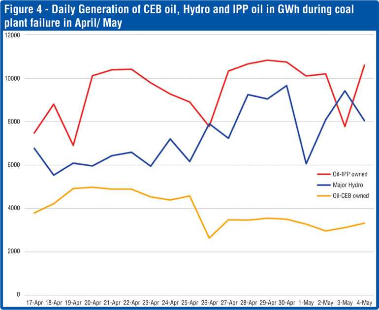 c. With the failure of the coal plant Unit 2 on 21 May, the CEB inexplicably reduced hydro generation, paving for extra generation from private oil power plants. On the day the power plant was back in operation (28th), CEB could have easily used hydro to remove private oil plants to reduce costs. (Figure 3)