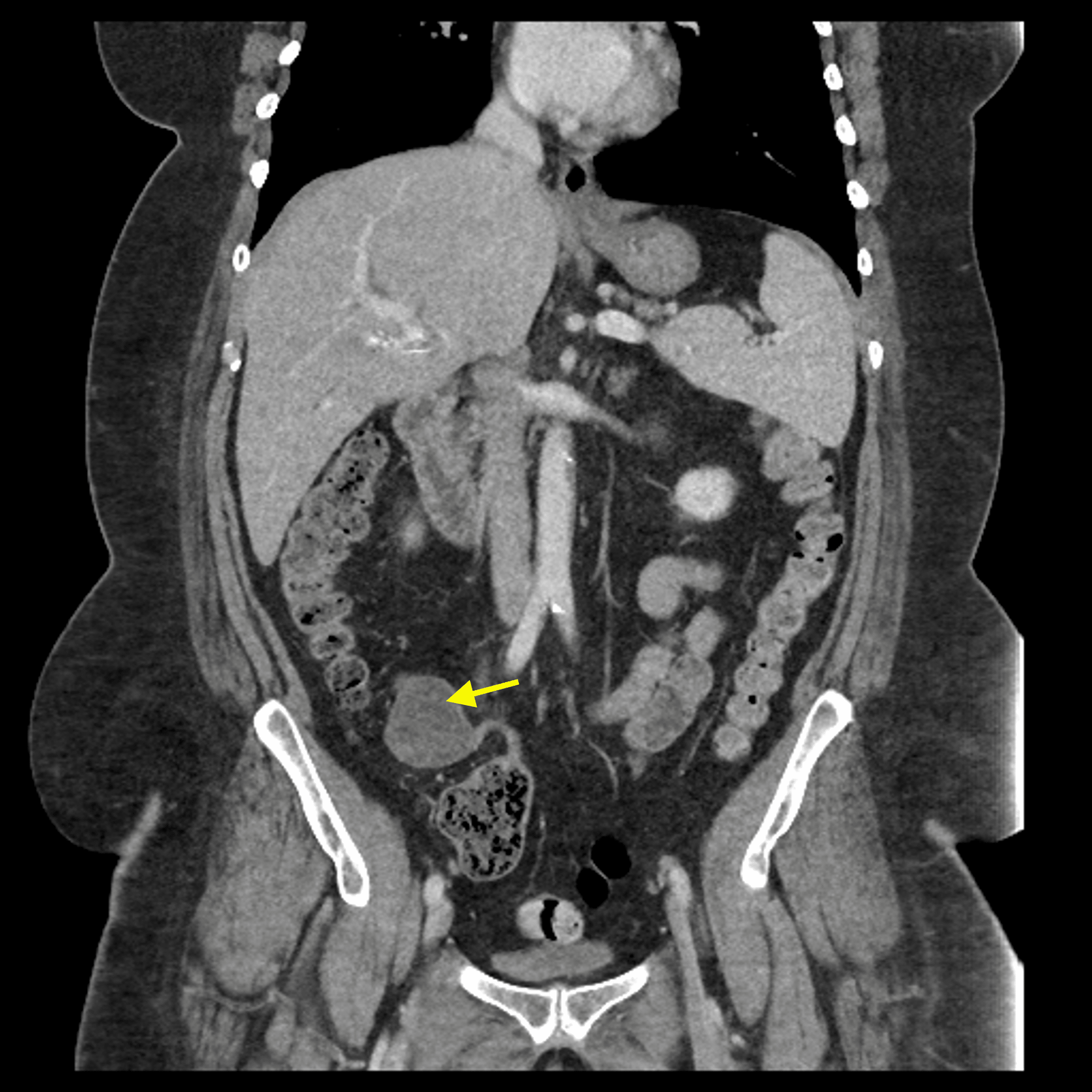 A 68-year-old male presented with microscopic hematuria. CT scan of his abdomen and pelvis with and without IV contrast revealed a 1.6-cm dilated appendix with fluid attenuation material and no surrounding inflammation or wall thickening. A laparoscopic appendectomy was performed. Given pathological examination demonstrated LAMN with pTis staging, appendectomy was considered sufficient for management.