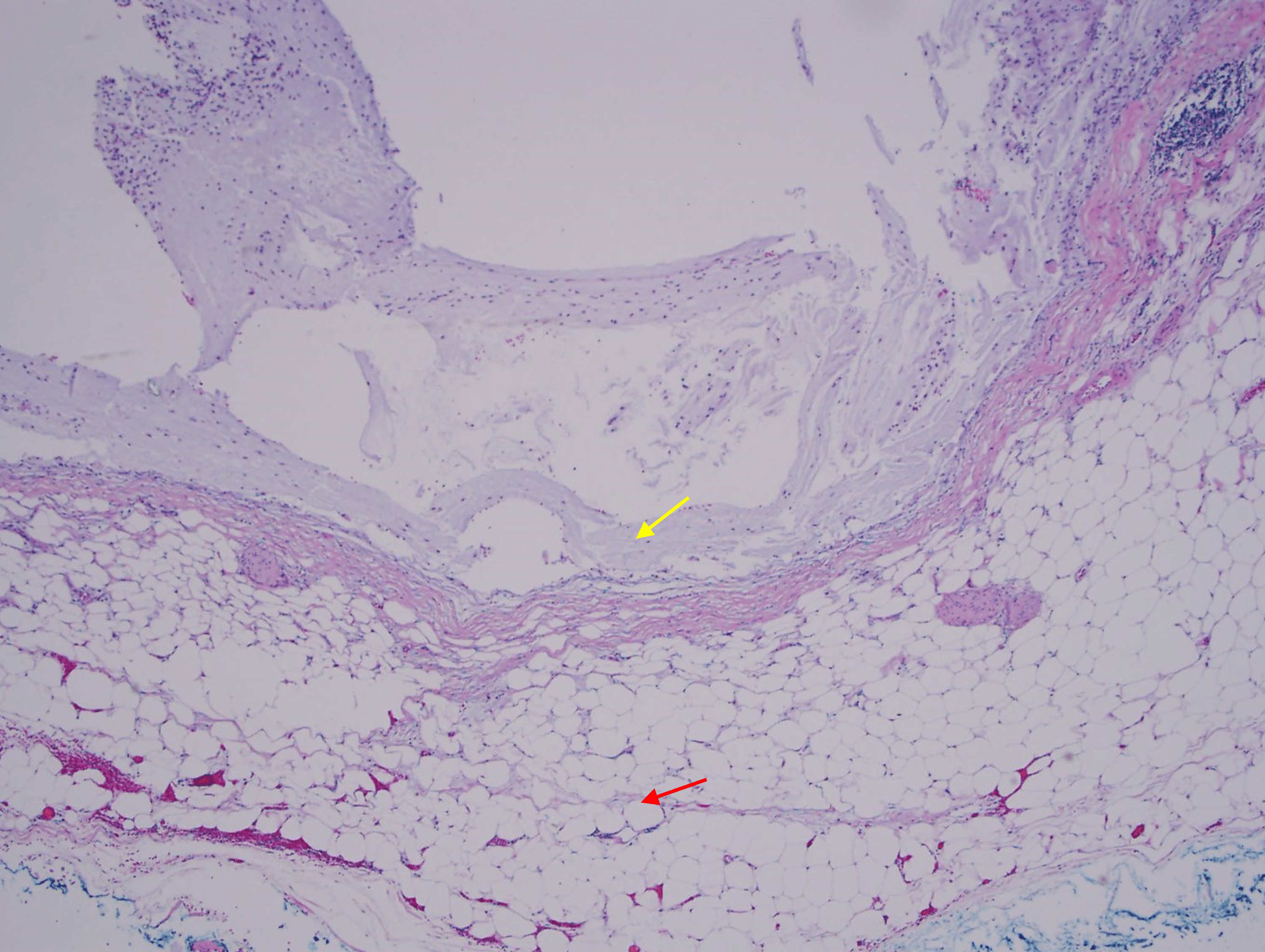 To reduce risks of rupture and PMP progression and examine for the presence of LAMN pathologically, surgical removal of the appendix is crucial for further diagnosis and management [1-3]. Options for removal include open and laparoscopic resection. While open surgery is sometimes recommended to prevent LAMN rupture and PMP, there are documented cases of rupture and PMP in both open and laparoscopic resection with no comparative study available [5]. Including a cuff of the cecum without involving the ileocecal valve is preferred during appendectomy to ensure removal of the lesion [6]. Gross examination shows a cystically dilated mucinous appendix with a hyalinized, thin, fibrotic, or calcified wall and a smooth, corrugated, or granular lining (Figure 1) [1-2]. Because LAMN does not spread via the hematogenous or lymphatic route, an appendectomy is generally acceptable for the management of LAMN confined to the appendix on pathology, with conservative follow-up and surveillance if the appendectomy margins involve acellular mucin or neoplastic epithelium (Figure 5) [2, 7-8]. If acellular mucin is extruded on the appendiceal serosal surface without peritoneal dissemination, an appendectomy with close observation and evaluation for PMP via routine imaging appears to be sufficient [1-2]. Though recommendations on imaging frequency and duration may vary given there are no formal guidelines, we recommend annual CT imaging for five to ten years. Additionally, supplemental right hemicolectomy does not provide advantages over appendectomy in these patients and can involve the retroperitoneum, which may result in the seeding of the mucinous epithelium [2, 8]. If there is peritoneal dissemination, management may require appendectomy, irrigation, a biopsy of peritoneal nodules, peritonectomy, and chemotherapy [3].
