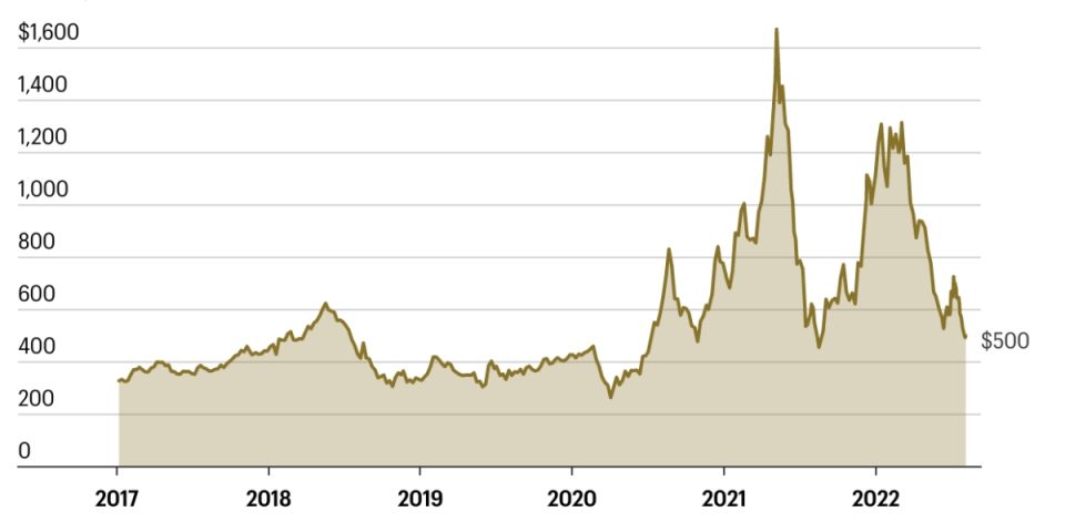 Lumber futures fell to just $500 per thousand board feet on Friday, or 62% below January’s $1,329 high.