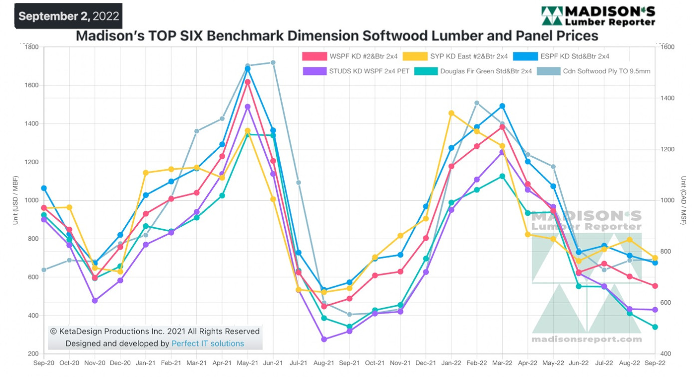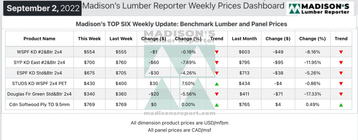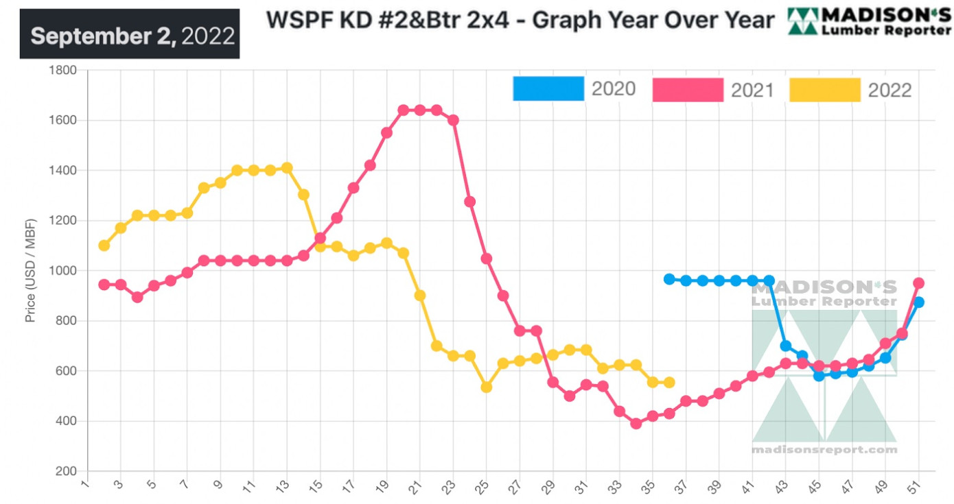 Continuing the waffling of most of this summer, for the week ending September 2, 2022 the price of benchmark softwood lumber item Western Spruce-Pine-Fir 2×4 #2&Btr KD (RL) was US$554 mfbm, said weekly forest products industry price guide newsletter Madison’s Lumber Reporter. This is down by -$1, or -0% from the previous week when it was $555, and is down by -$49, or -8%, from one month ago when it was $603.