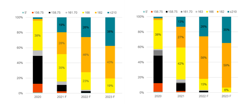 Third-party analysts had previously believed that manufacturing determines size, based simply on the capacity of cell production lines and the linear extrapolation of continual size increases over recent years, resulting in deviations between prediction and reality. In fact, size is determined by product value. M10 products were well received by clients in 2021 due to their superior overall performance, with a significant quantity of G12 wafer and cell capacity now converted to M10, as has also been the case with M6 capacity.