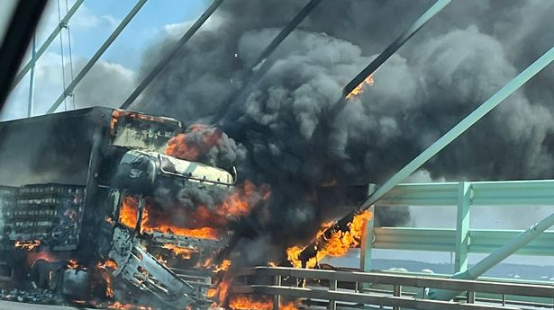 The M4 Prince of Wales bridge linking England and Wales over the River Severn was shut down heading to Wales after the lorry carrying pallets of wine burst into flames in the heat.