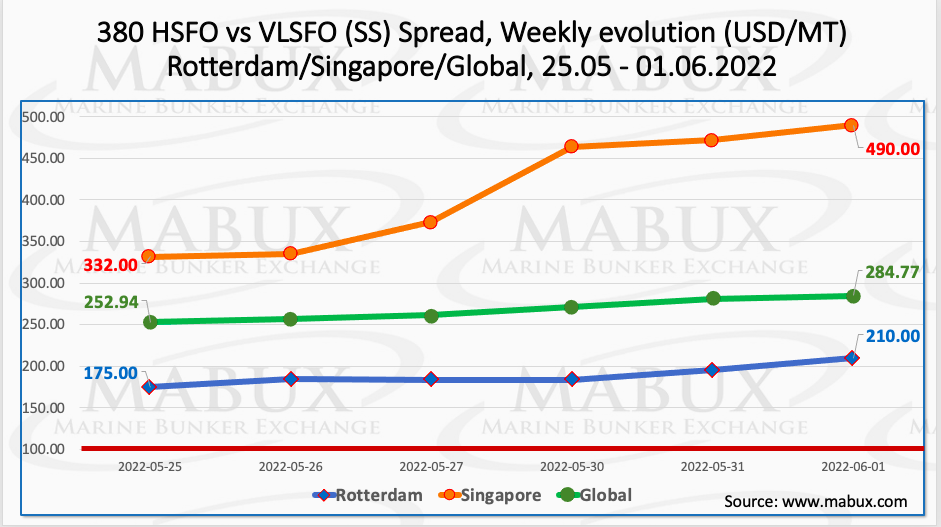 The Global Scrubber Spread (SS) weekly average – the price difference between 380 HSFO and VLSFO – continued its firm growth over the week – plus $ 26.98 ($ 268.11 versus $ 241.13 last week), reaching $ 284.77 on June 01 and setting a new all-time high mark (previous was $ 270 dated January 09, 2020). At the same time, in Rotterdam, the SS Spread’s average value rose less significantly: $189.00 vs. $178.83 (up $10.17 compared to last week). The most significantly the average price difference 380 HSFO/VLSFO rebounded in Singapore: $ 411.00 vs. $ 277.33 (plus $ 133.67 compared to the previous week), and on June 01 reached its all-time high mark of $ 490 (the previous one was $347 as of January 09, 2020). The sharp rise in SS Spread values has further increased the relevance and popularity of scrubbers. More information is available in the Price Differences section at mabux.com.