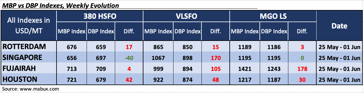 Over the week 22, the most significant change of MDI index weekly average (comparison of MABUX market bunker prices) vs MABUX digital bunker benchmark)) was the transition of 380 HSFO fuel at the port of Singapore to the undercharge zone: minus $40. In other selected ports, this type of fuel remained overvalued: Rotterdam – plus $17, Fujairah – plus $4 and Houston – plus $42, while overpricing gradually decreasing.