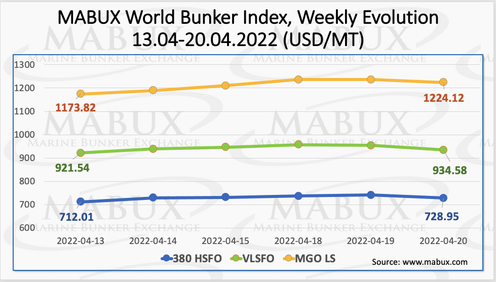 High volatility remains in the global bunker market, accompanied by sharp irregular changes of bunker indices. Over the Week 16, MABUX Bunker Index switched again to firm upward evolution. The 380 HSFO Index rose by 16.94 USD: from 712.01 USD/MT to 728.95 USD/MT. The VLSFO Index went up by 13.04 USD: from 921.54 USD/MT to 934.58 USD/MT. The MGO Index showed the most significant growth – by 50.30 USD (from 1173.82 USD/MT to 1224.12 USD/MT), due to a sharp decline in Russian oil products’ supplies in the global bunker market.