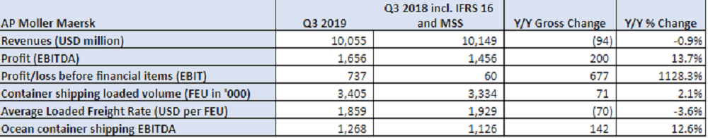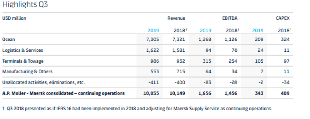 APMM (CPH: MAERSK-B) reported group revenues of $10.1 billion in the Q3 2019, down 0.9% year-on-year, and EBITDA of $1.7 billion, an increase of 14%.