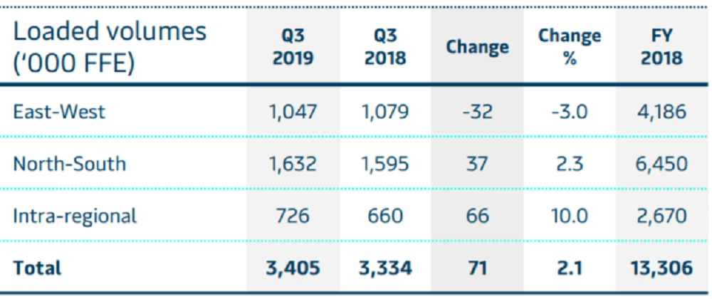The result was achieved despite the carrier’s average loaded freight rate declining 3.6% year-on-year in Q3 2019 and volumes increasing by only 2.1%.