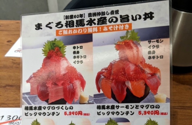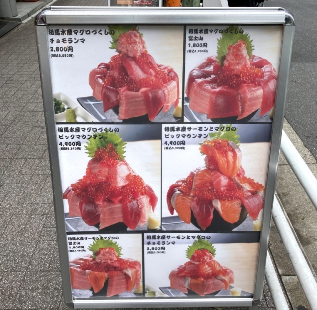 Even better, Maguro Soma Suisan specializes in maguro (tuna), which is exactly what Mr. Sato had his heart set on eating. Honestly, even if he hadn’t already been craving maguro, he would have been unable to to think of anything else after seeing the sign in front of Maguro Soma Suisan filled with photos of their maguro mountain bowls.