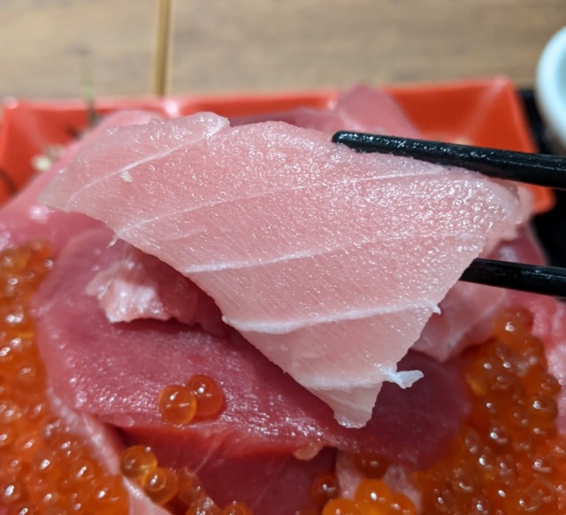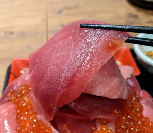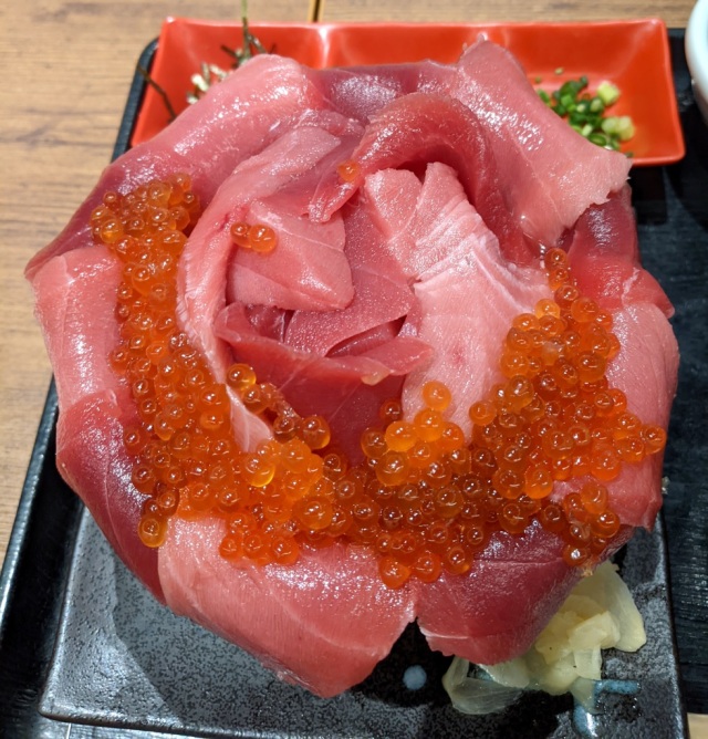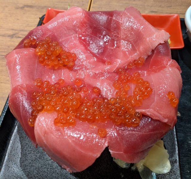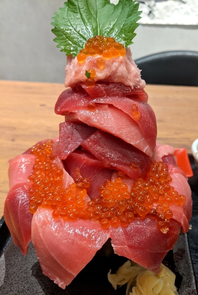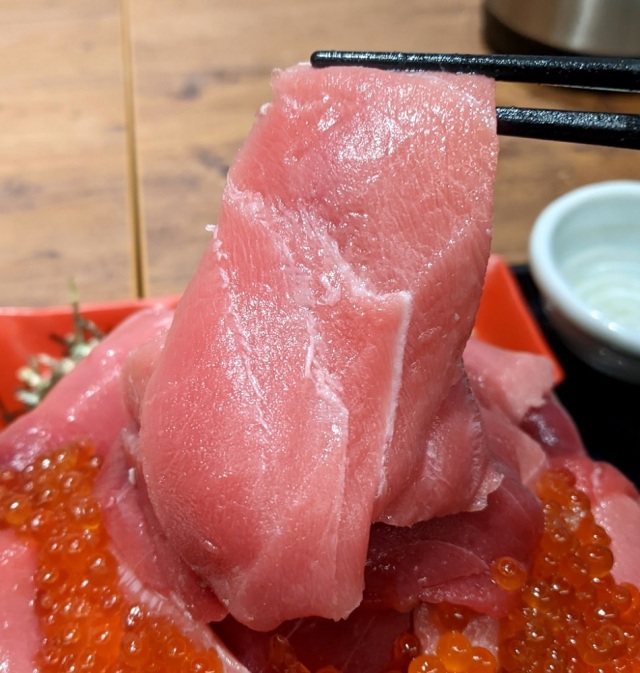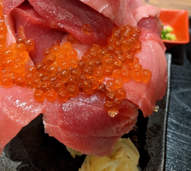 Then, where the base widens, you have more ikura and tuna, so much so that it completely obscures the rim of the bowl.