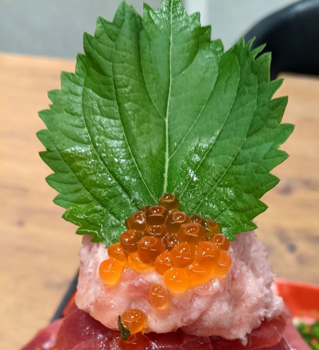 Let’s take a moment to admire the gastronomic geography of the Big Mountain. At the peak you’ve got a leaf of shiso (Japanese basil) and a sprinkling of ikura (salmon roe) looking like fallen snow atop a dollop of negitoro (diced tuna).