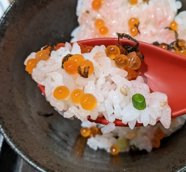 Finally, using a spoon, he was able to scoop up the last of the ikura, because you don’t order something this huge without wanting to eat as much as you possibly can.