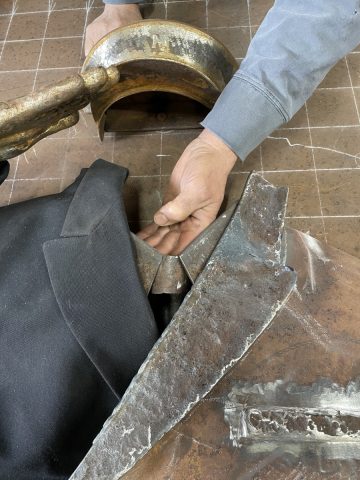 “El Faro Salute!” will feature two life-size torsos ― one male and one female ― wearing uniforms based off of actual Maine Maritime Academy uniforms. The jackets are being made from crumpled steel plates Sawyer obtained when the American Can Company was torn down in Portland in 2013.