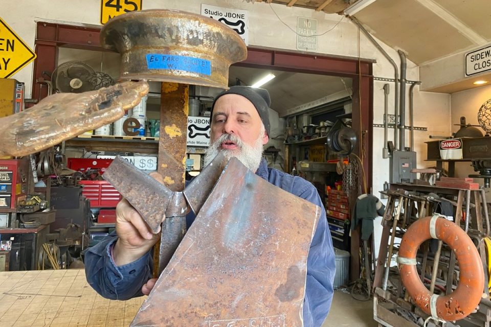 A Maine Maritime Academy graduate, Sawyer spent five years at sea as a marine engineer before establishing his career as a welder back on shore. It was only later that he began using his welding skills as a professional artist working primarily with salvaged metal materials. And right now, he’s using his skills to create an homage to a tragedy at sea, something that hits close to home.