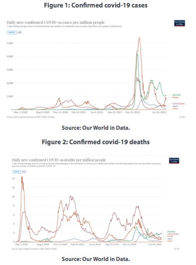 This is now preventing the gradual return to a normal social and economic life. As Australia has illustrated (figures 1 and 2), removing restrictions after a prolonged zero-covid policy period takes an unavoidable medical toll in terms of increased cases and deaths. This can be mitigated by protecting the elderly and the most vulnerable with social distancing measures and effective early medical treatment. But reintroducing lockdowns is clearly not the solution. Scientific evidence after two years of pandemic shows that the zero-covid policy’s costs largely exceeded its alleged health benefits.