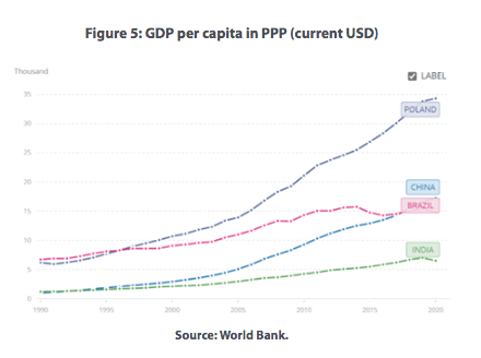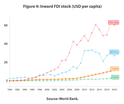However, in terms of accumulated FDI stock per capita, China could do much better. Although it outperforms India, for example, China trails other emerging economies, such as Brazil and Poland (figure 4). These countries’ relative per capita GDPs (figure 5) reflect this, and suggest that China should attract more FDI if it wants to catch up with the West faster.