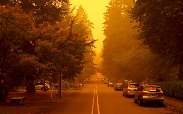 In a photo provided by Christian Gallagher, a street in West Linn, Ore., is shrouded by smoke from wildfires, Thursday, Sept. 10, 2020. (Christian Gallagher via AP)
