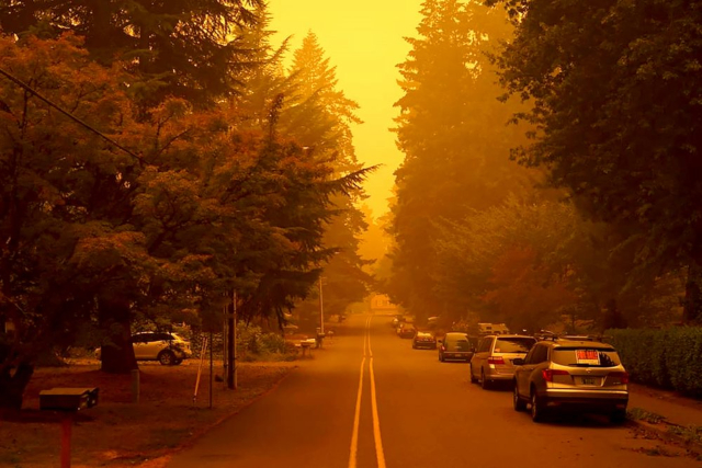 In a photo provided by Christian Gallagher, a street in West Linn, Ore., is shrouded by smoke from wildfires, Thursday, Sept. 10, 2020. (Christian Gallagher via AP)