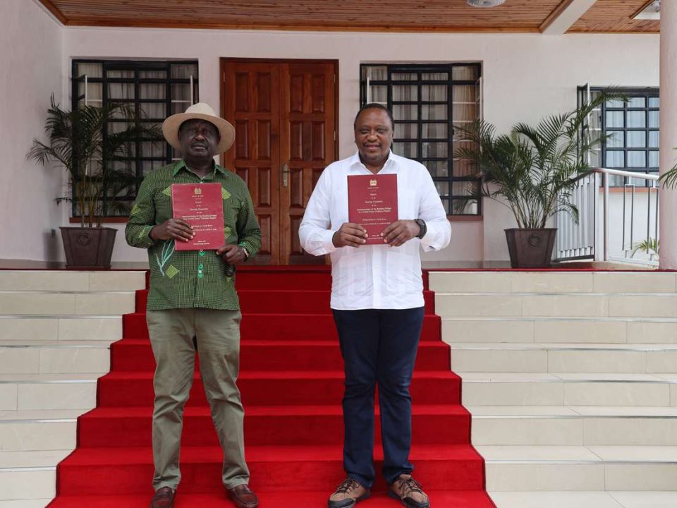President Uhuru Kenyatta and former Prime Minister display a copy of BBI Report during the presentation at Kisii State Lodge. PHOTO | PSCU