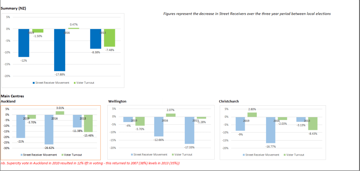 Across local body elections after 2013 the study shows voter turnout rising in some years when there were large drops in the number of “mailbox receivers”.