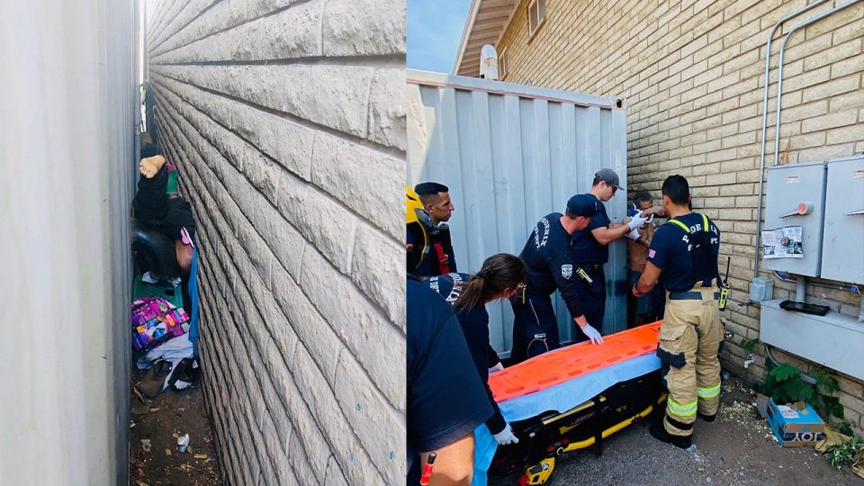 PHOENIX – Crews worked to rescue a man who became trapped between a 24-foot shipping container box and a wall in Phoenix on Sunday, April 24.