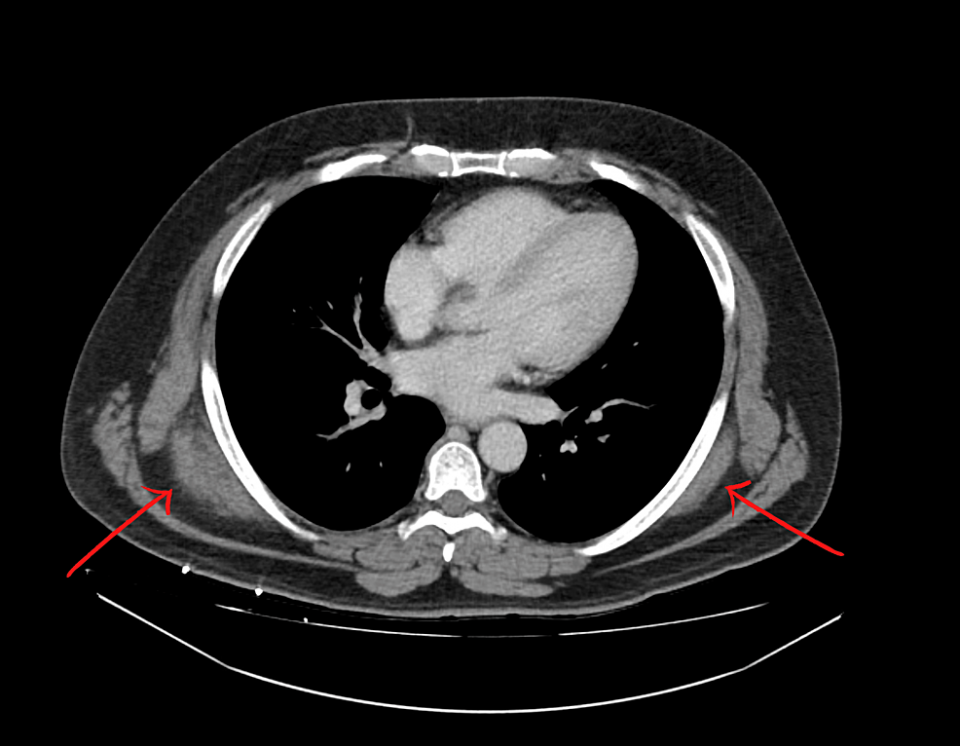 CT scan of the chest with IV contrast showed bilateral soft tissue masses present in the upper back immediately deep to the trapezius and latissimus dorsi muscles and posterior to the serratus musculature (Figure 1). On the right, the mass measured 7.3 x 3.1 x 6.5 cm. On the left, the mass measured 6.8 x 1.3 x 5.6 cm. The CT scan findings were reported as consistent with ED