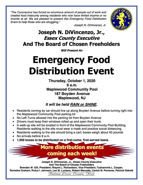 ESSEX COUNTY, NJ — The Maplewood Community Pool will be the next site for the Essex County Emergency Food Distribution Event on Thursday, October 1 to help families negatively impacted by coronavirus. The 1,000 boxes of food that will be distributed are meant to benefit families who have been impacted by the pandemic and are facing food insecurity. Residents will receive one box of non-perishable food items.