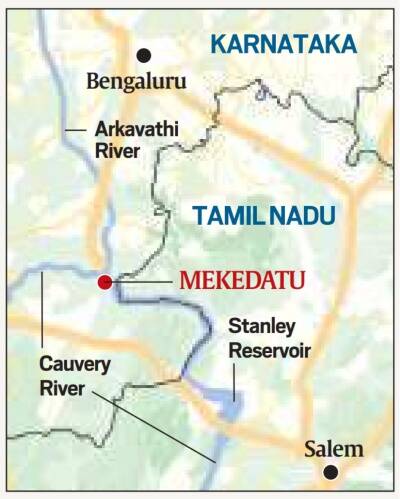 Proposed by Karnataka, the project envisages a reservoir near Ontigondlu, about 1.5 km from Mekedatu (which literally means goat’s leap) in Ramanagara district of south Karnataka at the confluence of the Cauvery and Arkavathi rivers. It is 4 km from the Tamil Nadu border and 100 km from Bengaluru.