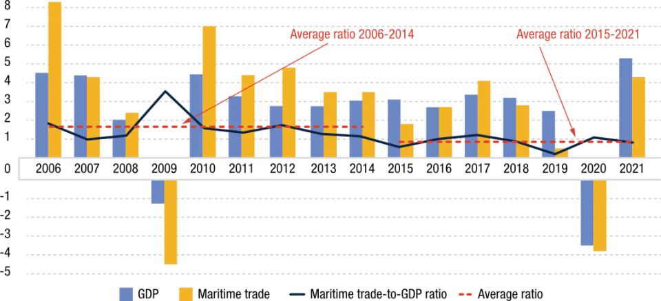 International maritime trade, world gross domestic product (GDP) and maritime trade-to-GDP ratio, 2006 to 2021