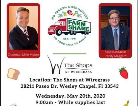 A free Farm Share food drive-thru distribution event will take place Wednesday, May 20 at 9 a.m. Sponsored by Pasco County Commission Chairman Mike Moore and state Rep. Randy Maggard at the Shops at Wiregrass in Wesley Chapel, the distribution will be in Lot C near JCPenney.