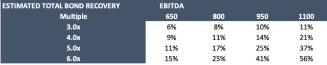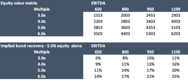 Doing this – and diluting down the original 5.5% equity ownership for each of the new warrant tranches, assuming they are in the money – and total bondholder recovery at these EBITDA and multiple assumptions looks like this: