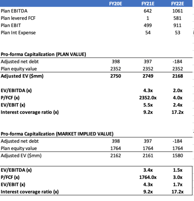 Using the estimates provided by management to the bankruptcy court, Pro-Forma valuation looks like this. Note the discrepancy between Plan Value (more expensive) and Market Value (cheaper) – since the term loans and bonds (the new equity securities) are trading ~25-30% cheap to assumed plan equity value. Also, I leave FY20 out of it since half the year will be consumed by the court process, and I have already taxed newco EV with the estimated losses/cash burn from 2H20E, so I think its right to appraise the new MDR based on 2021 numbers and onwards: