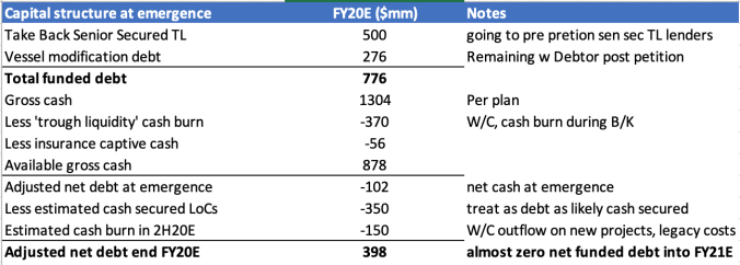 Subsequent to the Lummus sale, then, MDR will have just $776mm in funded debt (the $500mm take-back paper and the $276mm vessel modification debt), and $1.3bn of gross cash at emergence (according to the business plan and Evercore analysis included at the back of the Disclosure statement). The pro-forma capital structure – and my adjusted net debt estimate entering FY21E – as per below:
