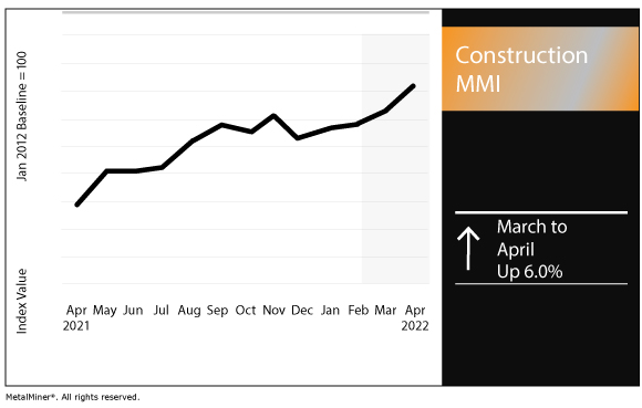 The Construction Monthly Metals Index (MMI) picked up by 6.0% for this month’s reading, as rising metal prices push up the cost of doing business in the construction sector.
