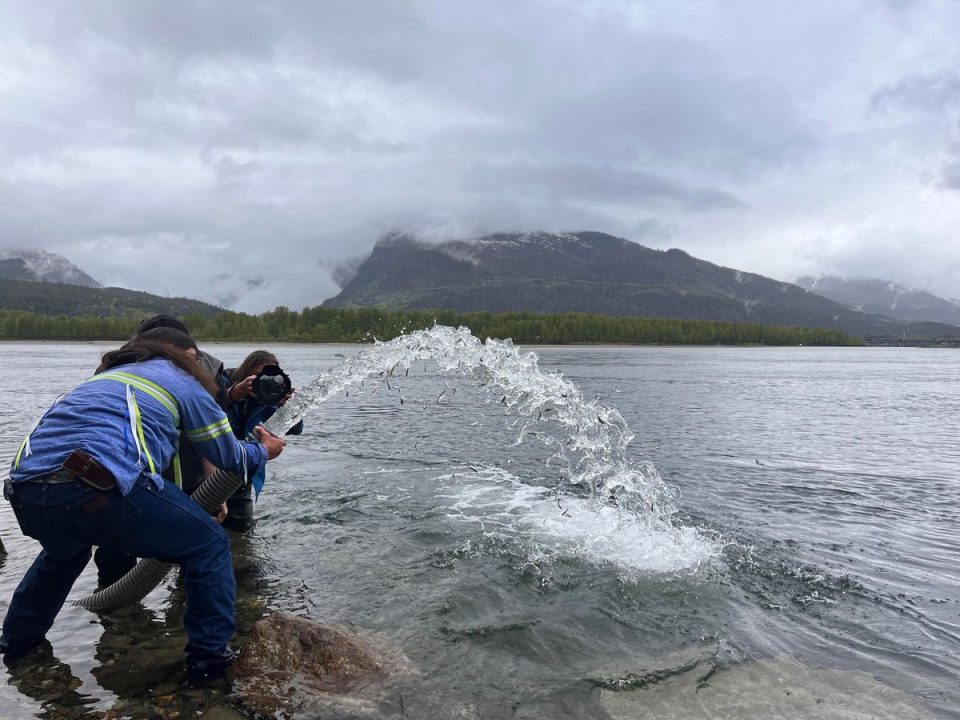 Salmon fry are poured out of a hose into the Columbia River near Revelstoke, B.C.Photos by Okanagan Nation Alliance