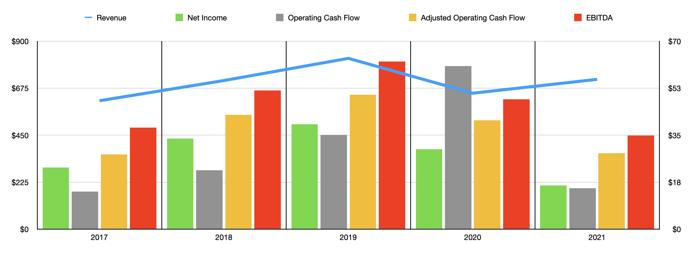 Other cash flow metrics have followed a similar path. Operating cash flow grew from $14 million in 2017 to $60.7 million in 2020. Then, in 2021, it plunged to just $15.3 million. If we adjust for changes in working capital, it would have risen from $27.9 million in 2017 to $50.1 million in 2019 before dropping to $40.6 million in 2020 and then to $28.3 million last year. Another metric that followed suit here was EBITDA, ultimately peaking at $62.4 million in 2019 before dropping to $34.9 million last year.