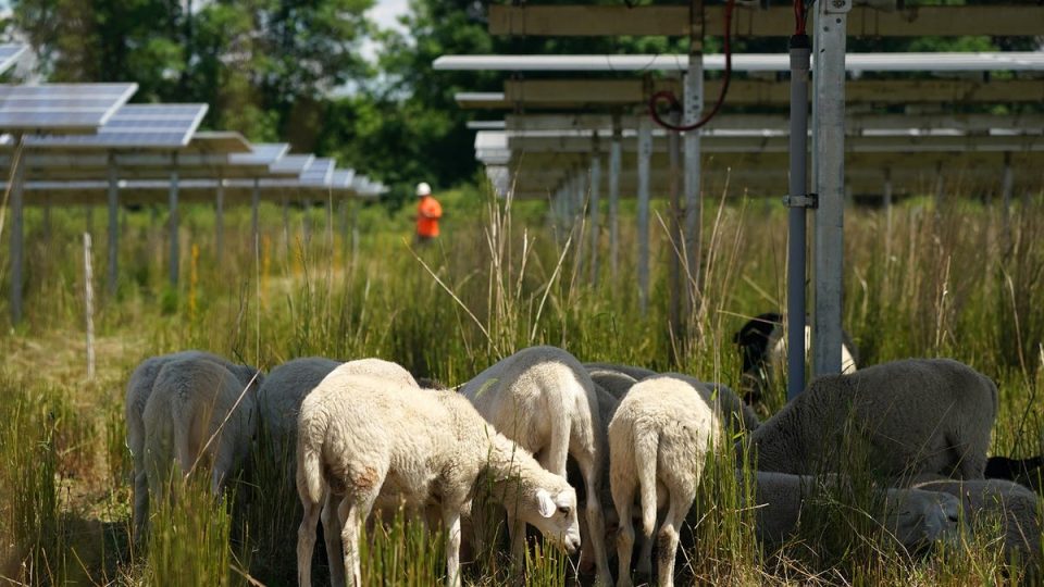 The sheep do come with a few challenges. As they sauntered around the rows of panels Wednesday, workers were repairing an electric fence that a few ornery rams had torn through.