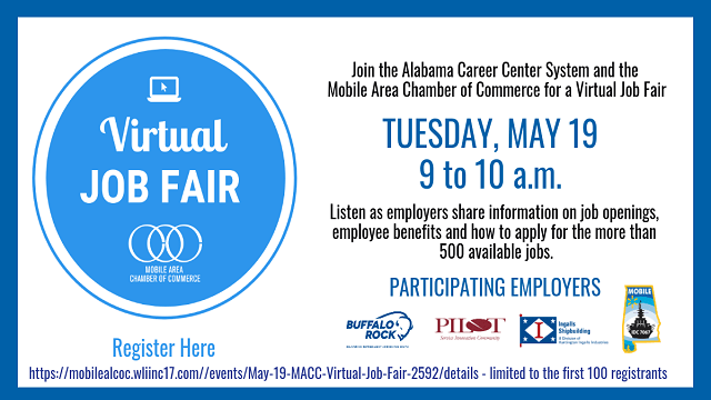 The Mobile Area Chamber is going virtual, and its first public event will be a job fair via Zoom. The free, hour-long event is set for Tuesday, May 19, beginning at 9 a.m.
