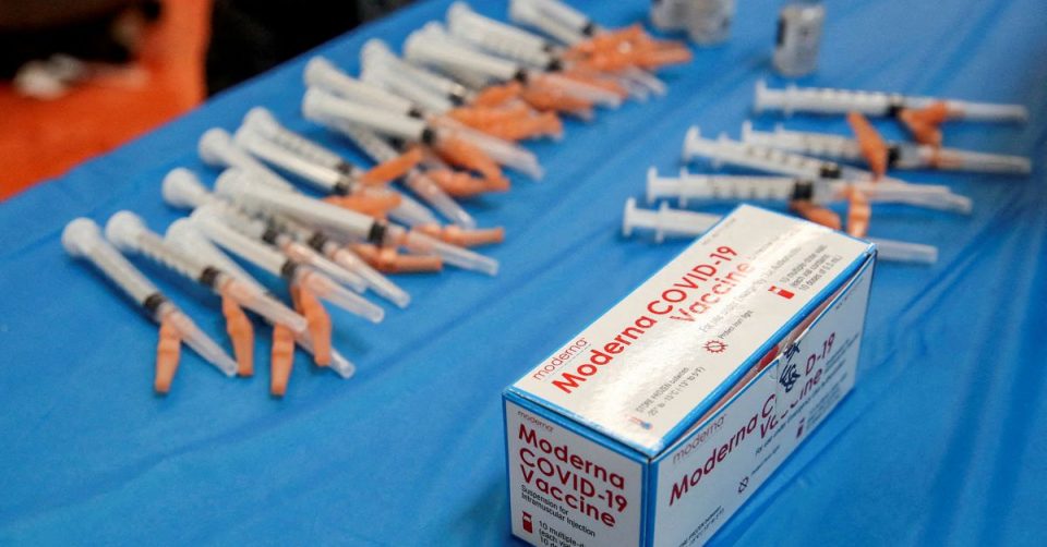 The Moderna COVID-19 vaccine sits on the table at Trinity United Church of Christ in Chicago, Illinois, U.S., February 13, 2021. REUTERS/Kamil Krzaczynski/File Photo
