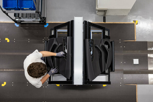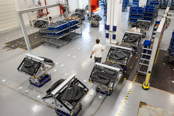 At another station, a worker assembles the entire sun blind that is available for the rear doors as an option. Because of its predefined tempo, at the conveyor belt this task would have to be divided up between two or three workers, which is inefficient and can jeopardize quality. If jobs are piling up at one station, the AGVs drive the product to the next required station with the least possible amount of waiting time. In addition, the configuration of the workspaces is cyclically checked and adjusted.