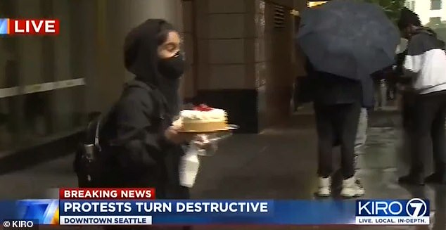 The reporter tells viewers: ‘You see someone actually walking away with a cheesecake there after the cheesecake factory was looted. ‘Unclear where they may have got that’
