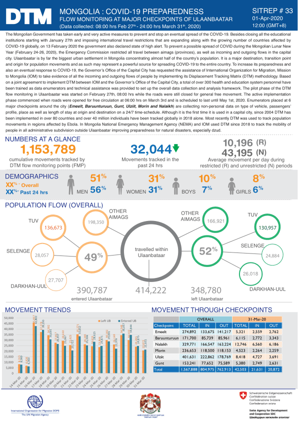 The Mongolian Government has taken early and very active measures to prevent and stop an eventual spread of the COVID-19. Besides closing all the educational institutions starting with January 27th and imposing international travel restrictions that are expanding along with the growing number of countries affected by COVID-19 globally, on 13 February 2020 the government also declared state of high alert. To prevent a possible spread of COVID during the Mongolian Lunar New Year (February 24-26, 2020), the Emergency Commission restricted all travel between aimags (provinces), as well as incoming and outgoing flows in the capital city. Ulaanbaatar is by far the biggest urban settlement in Mongolia concentrating almost half of the country’s population. It is a major destination, transition point and origin for population movements and as such may represent a powerful source for spreading COVID-19 to the entire country. To increase its preparedness and also an eventual response to COVID-19, the Governor’s Office of the Capital City has requested the assistance of International Organization for Migration, Mission to Mongolia (IOM) to take evidence of all the incoming and outgoing flows of people by implementing its Displacement Tracking Matrix (DTM) methodology. Based on a joint agreement to implement DTM between IOM and the Governor’s Office of the Capital City, a total of over 300 health and education system personnel have been trained as data enumerators and technical assistance was provided to set up the overall data collection and analysis framework. The pilot phase of the DTM flow monitoring in Ulaanbaatar was started on February 27th, 08:00 hrs while the roads were still closed for general free movement. The active implementation phase commenced when roads were opened for free circulation at 06:00 hrs on March 3rd and is scheduled to last until May 1st, 2020. Enumerators placed at 6 major checkpoints around the city (Emeelt, Baruunturuun, Gunt, Ulziit, Morin and Nalaikh) are collecting non-personal data on type of vehicle, passengers’ profile, place as well as length of stay at origin and destination on a 24/7 time-schedule. Although it is the first time it is used in a capital city, since 2004 DTM has been implemented in over 80 countries and over 40 million individuals have been tracked globally in 2018 alone. Most recently DTM was used to track population movements in regions affected by Ebola. In Mongolia National Emergency Management Agency (NEMA) and IOM used DTM since 2018 to track the mobility of people in all administrative subdivision outside Ulaanbaatar improving preparedness for natural disasters, especially dzud.