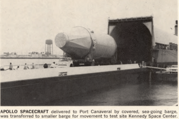 Saturn IV B, the second stage of the moon craft, arrived at the Port Canaveral wharf aboard a specially constructed barge, the USNS Point Barrow, and was transferred to a second barge that carried it through the Canaveral lock to the Vehicle Assembly building at the National Aeronautics and Space Administration Kennedy Space Center, where it is undergoing tests for launching later this year.