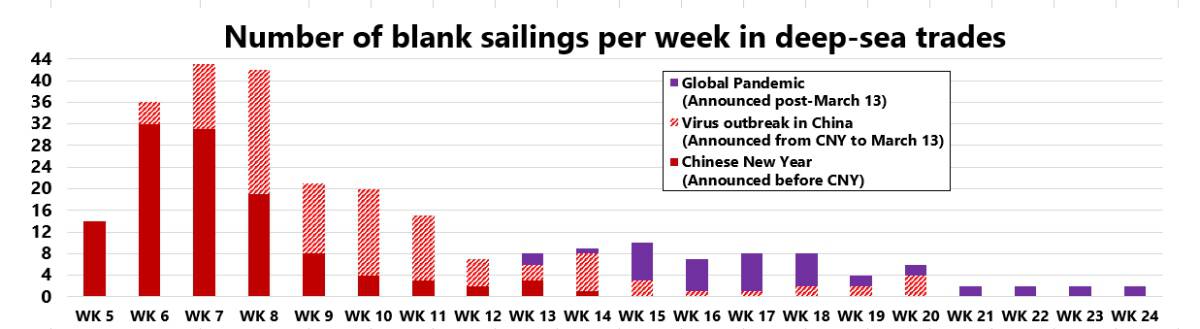 According to Alan Murphy, CEO and founder of Copenhagen-based Sea-Intelligence, “Within the past week, the number of blank sailings announced following the pandemic spread increased from two to 45 on main deep-sea trades.”